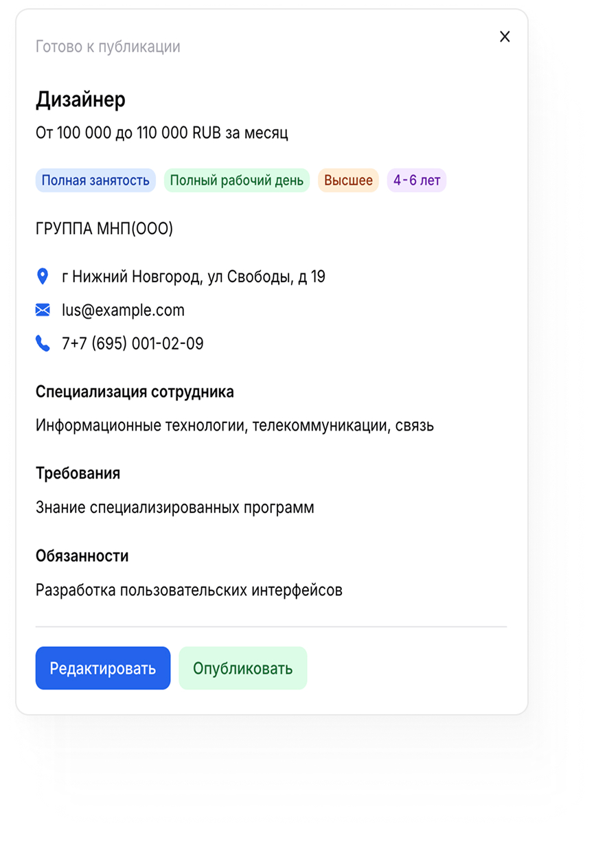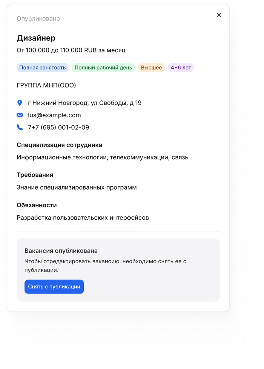 В мобильном приложении такая вакансия становится недоступной. Если в ранее одобренную вакансию не вносить изменений, её можно опубликовать повторно без модерации — просто нажмите «Опубликовать».